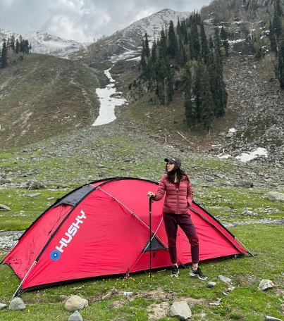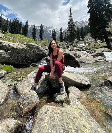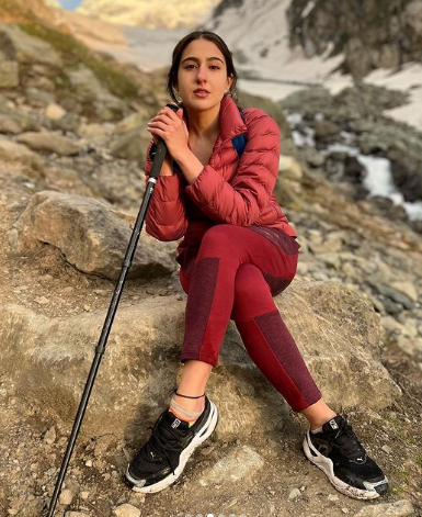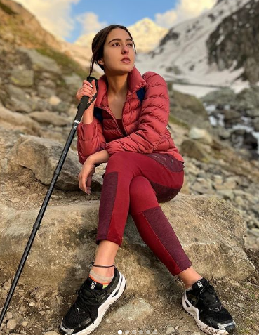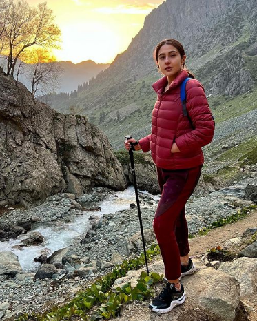 सारा अली खान ने अपने इंस्टाग्राम अकाउंट पर कश्मीर ट्रिप की तस्वीरें शेयर की हैं। इन तस्वीरों में उन्हें पहलगाम में ट्रेकिंग और कैंपिंग करते हुए देखा जा सकता है। सारा को तस्वीरों में मैरून रंग की एथलीजर और मैचिंग जैकेट पहने देखा जा सकता है। उसने अपने बालों को एक बैक पोनी में बांधा है और कश्मीर घाटी की प्राकृतिक सुंदरता का आनंद ले रही। कैप्शन में, सारा ने अपने काव्यात्मक पक्ष को दिखाया और लिखा, "कश्मीर की कली... आपकी गली में वापस आ गई है ... अब ट्रेकिंग पर मैं चली।"