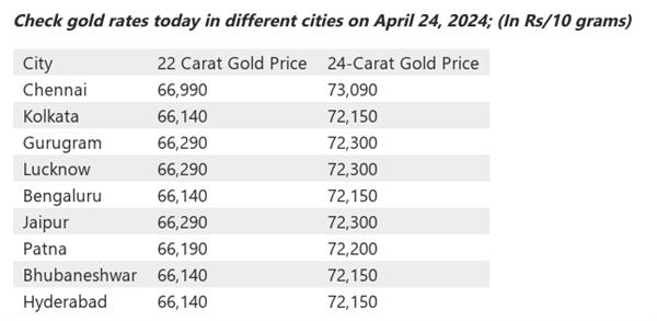 As of April 24, 2024, in Delhi, the price for 10 grams of 22-carat gold is approximately Rs 66,290, while 24-carat gold is priced at roughly Rs 72,300.