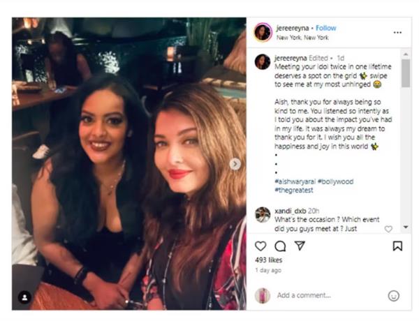 दरअसल, न्यूयॉर्क की रहने वाली जेरी रेयना नाम की एक फैन ने ऐश्वर्या राय के साथ एक तस्वीर साझा की है। ऐश्वर्या को रेड और ब्लैक कलर की ड्रेस में देखा जा सकता है। तस्वीर किसी रेस्तरां की लग रही है। फैन के साथ तस्वीर में ऐश्वर्या मुस्कुराती नजर आ रही हैं।