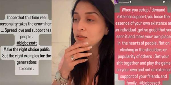 अभिनेत्री मन्नारा चोपड़ा बिग बॉस 17 में दिखाई दी थीं, जहाँ वह शो की सेकेंड रनरअप बनी थीं। मुनव्वर इस सीजन के विनर रहे थे। मन्नारा शो के दौरान काफी चर्चा में रही थीं और मुनव्वर के साथ उनकी दोस्ती की भी खूब बात हुई। अब मन्नारा ने खुलासा किया है कि वह बिग बॉस ओटीटी 3 को भी फॉलो कर रही हैं। हाल ही में, उन्होंने अपनी इंस्टाग्राम स्टोरी पर एक वीडियो शेयर किया जिसमें वह फैंस से गुजारिश कर रही हैं कि वे शो के उन कंटेस्टेंट्स को वोट दें जो असली हैं।