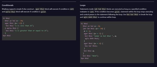 HTML, CSS, Java, JavaScript, C++, Python, और कुछ अन्य के बाद, हाल ही में "Bhai-Lang" नामक एक और नई प्रोग्रामिंग भाषा पेश की गई है। यह नई Javascript library दो इंजीनियरों, जो क्रमशः Groww और Amazon में दोनों सॉफ्टवेयर डेवलपमेंट इंजीनियर हैं, ऋषभ त्रिपाठी और अनिकेत सिंह द्वारा बनाई गई है।